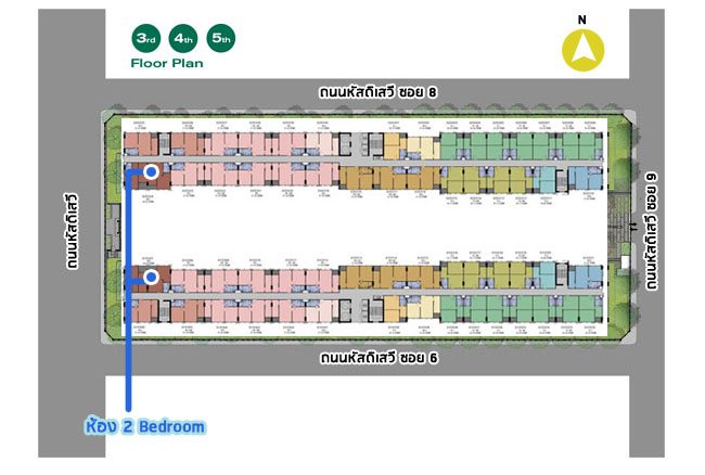 Master Plan ชั้น 3-5 จะเหมือนกัน ซึ่งก็คล้ายๆ กับชั้น 2 คือเป็นส่วนพักอาศัยทั้งหมดเหมือน แต่จะไม่มี Roof Garden ส่วนจำนวนยูนิตพักอาศัยจะขยับมาอยู่ที่ 30 ยูนิต/ชั้น ลิฟต์โดยสารอาคารละ 2 ตัวเหมือนเดิม และสำหรับห้องฝั่งทิศตะวันออกที่อยู่ประมาณชั้น 4 ขึ้นไปจะสามารถมองเห็นวิวดอยสุดเทพได้จากในห้องด้วยค่ะ