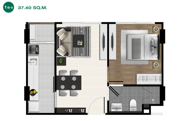 Layout ห้องแบบ 1 ห้องนอน ขนาด 37.40 ตร.ม. มี 1 ห้องน้ำ 1 ห้องนั่งเล่น และ 1 ห้องครัว (แบบปิด)