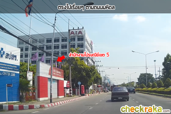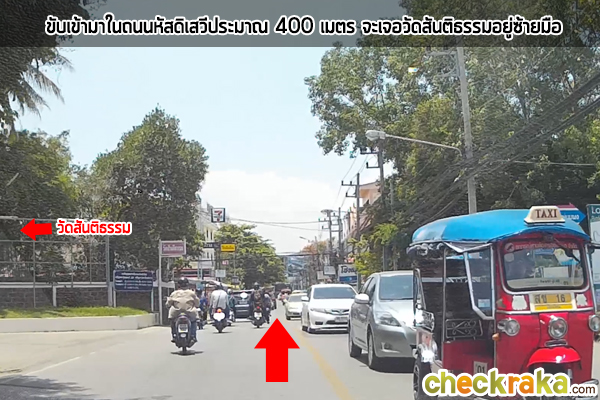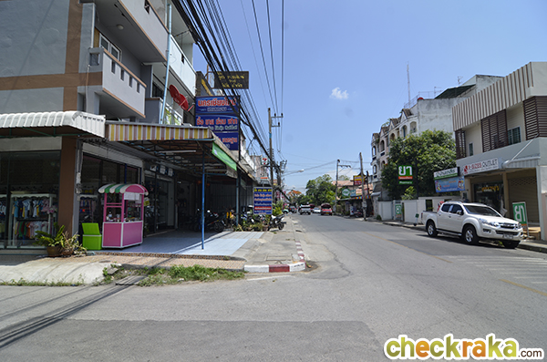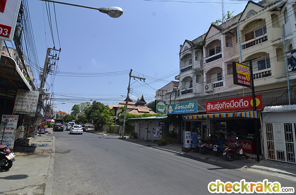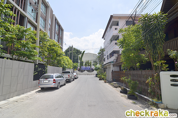 ขวามือเป็นบ้านทรงไทย และตรงไปอีกก็จะเป็นอาคารพาณิชย์สูง 4 ชั้น ติดถนนหัสดิเสวี