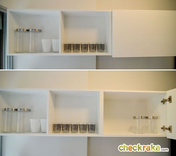 ด้านบนเคาน์เตอร์เป็นชั้นวางของสีขาวแบบนี้ค่ะ เป็นแบบบานเปิด 2 บาน และบานปิดอีก 1 บาน