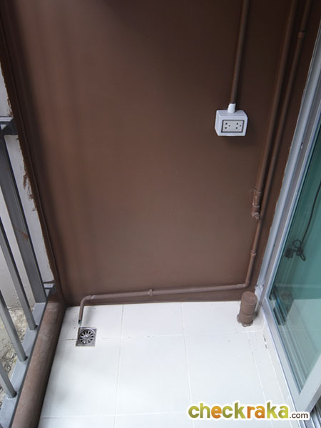 ด้านนอกระเบียงติดตั้งราวกันตก พร้อมท่อน้ำดีน้ำทิ้ง พร้อมปลั๊กสำหรับวางเครื่องซักผ้าไว้ให้เรียบร้อย