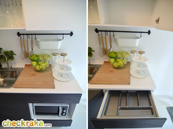 ด้านล่างเป็นช่องสำหรับวางไมโครเวฟ ด้านบนเป็นลิ้นชักเก็บพวกช้อนส้อมค่ะ ราวเหล็กติดผนังที่เห็นไม่ได้นะคะ