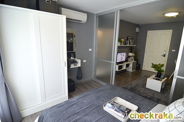 ห้อง Studio ขนาด 30 ตารางเมตร ขายแบบ Fully Furnished ได้เฟอร์นิเจอร์ลอยตัวของ Modernform ทีดีไซน์มาพิเศษเฉพาะโครงการนี้ ตามแบบห้องตัวอย่างเลยค่ะ ยกเว้นของตกแต่ง เครื่องใช้ไฟฟ้า และวอลล์เปเปอร์ ความพิเศษของห้อง Studio นี้ คือทางโครงการกั้นห้องนอนมาให้ด้วย เหมือนซึ้อห้องแบบ Studio แต่ว่าได้ห้องแบบ 1 ห้องนอน พร้อมแอร์ Daikin ขนาด 12,000 BTU 1 เครื่องภายในห้องนอน ความสูงจากพื้นถึงฝ้าอยู่ที่ 2.5 เมตร พื้นเป็นลามิเนตขนาด 8 มม.