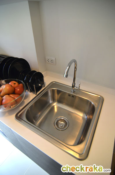 ได้อ่างล้างจานสแตนเลสแบบหลุมเดียวยี่ห้อ HAFELE ผนังครัวเป็นฉาบเรียบสีขาว เวลาทำครัวอาจเปื้อนได้ง่าย แนะนำให้ติดเป็นกระเบื้องโมเสค หรือกระเบื้องเนื้อเดียวแผ่นใหญ่จะช่วยให้ทำความสะอาดง่ายขึ้น