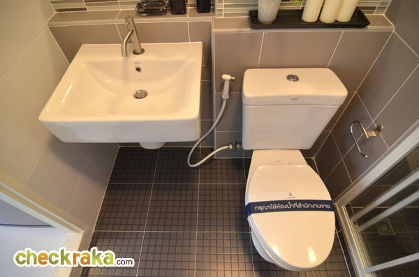 อ่างล้างหน้า โถสุขภัณฑ์เป็นของ Amarican Standard และสายฉีดชำระอยู่ทางขวามือ