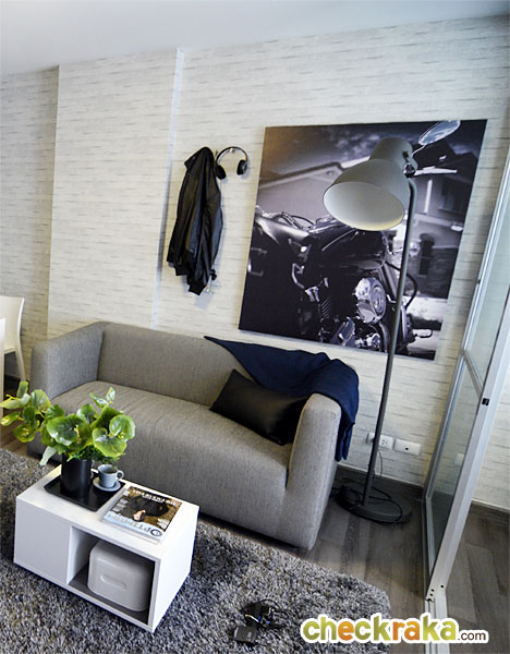 ส่วน Living Area ติดกับหน้าต่างบานใหญ่ มองออกไปเป็นวิว Roof Garden และสระว่ายน้ำส่วนกลาง