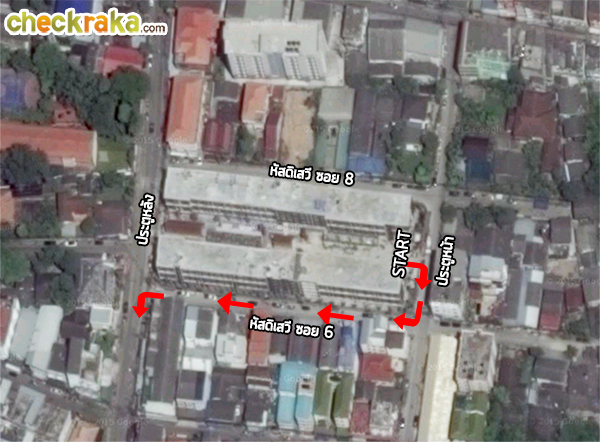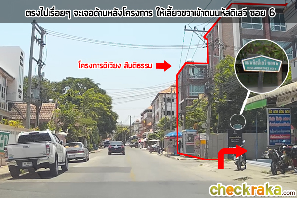 เดินตรงมาเรื่อยๆ จะเจอหัสดิเสวีซอย 6 เป็นซอยที่อยู่ติดกับอาคารเอของโครงการดีเวียงสันติธรรม