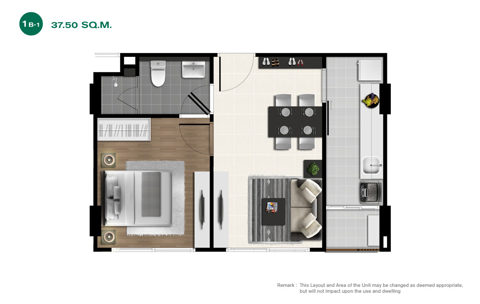 Layout ห้องแบบ 1 ห้องนอน ขนาด 37.40 ตร.ม. มี 1 ห้องน้ำ 1 ห้องนั่งเล่น และ 1 ห้องครัว (แบบปิด)