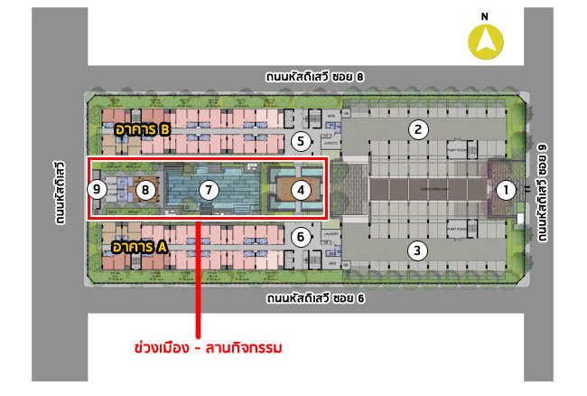 - หมายเลข 2-3 : พื้นจอดรถบริเวณใต้อาคาร A และ B รวมแล้วประมาณ 30% (แบบไม่รวมจอดซ้อนคัน)
