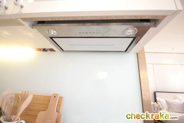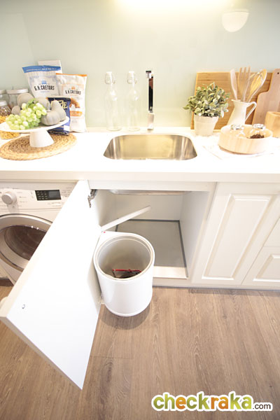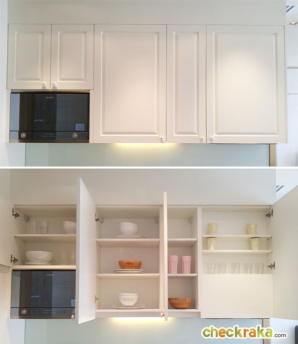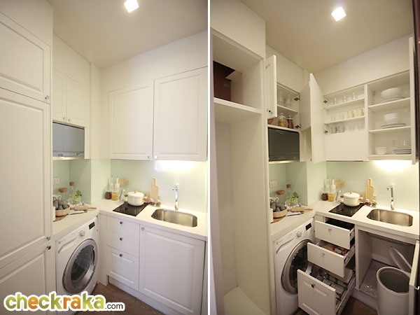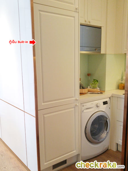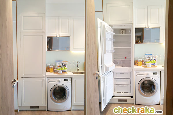 ให้เตาอบอยู่ทางฝั่งซ้ายของครัว เหนือตำแหน่งเครื่องซักผ้า ด้านบนมีตู้เก็บของให้มาด้วย แต่อยู่ค่อนข้างสูงไปซักหน่อย สำหรับผู้หญิงตัวเล็ก อาจจะหยิบจับไม่ค่อยสะดวกเท่าไหร่