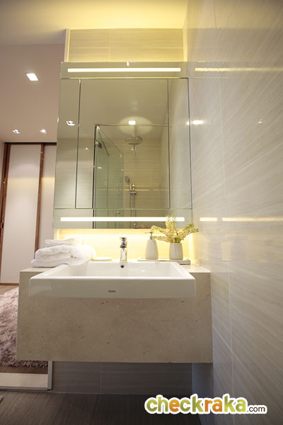 ย้ายเข้าไปดูในห้องน้ำกันค่ะ ด้านหน้าที่เห็นเป็นตู้เสื้อผ้าเป็นเพียงของตกแต่งที่ทางโครงการออกแบบให้ดูเป็นไอเดียเท่านั้น