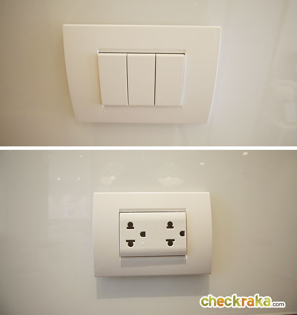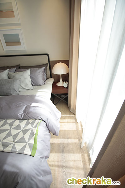 ด้านข้างของเตียงสามารถวางโต๊ะหัวเตียงได้ด้วย ส่วนปลั๊กไฟที่เห็นบริเวณข้างหัวเตียง