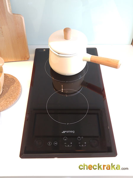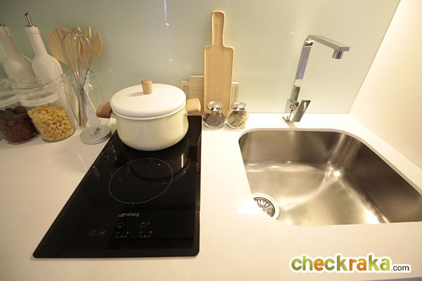 ล้างจานเป็นแบบหลุมเดียว ยี่ห้อ Smeg ก็อกน้ำ ยี่ห้อ Mex พร้อมผนังเคาน์เตอร์ครัวแบบกระจกง่ายต่อการทำความสะอาด