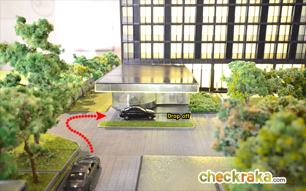 ส่วนที่จอดรถจะอยู่ชั้นใต้ดิน (ชั้น B1 - B5) โดยทางขึ้น-ลงจะอยู่ทางทิศตะวันตกของตัวอาคาร