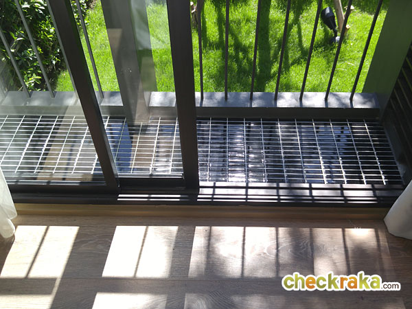 ราวระเบียงกันตกสูง 1.2 เมตร มีพื้นที่จัดเก็บคอมเพรสเซอร์แอร์ด้านข้างของระเบียง เป่าลมร้อนออกนอกอาคาร