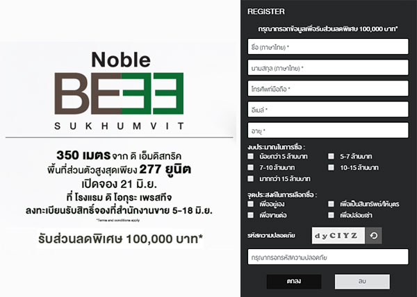 - ส่วนลดพิเศษ 100,000 บาท มอบให้เฉพาะผู้ที่กรอกข้อมูลลงทะเบียนผ่านเว็บไซต์ www.noblehome.com (ตามลิงก์ด้านล่าง) และลงทะเบียนที่สำนักงานขายเท่านั้น