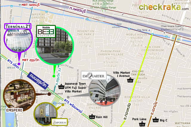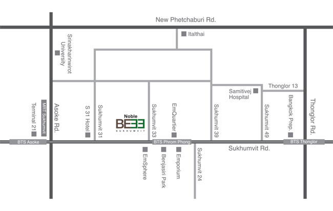 - ทำเลรอบโครงการ - โครงการนี้ตั้งอยู่ภายในซอยสุขุมวิท 33 เป็นโครงการที่ใกล้กับสามห้างฯ ใหญ่ กับ The Em District ได้แก่ ดิ เอ็มโพเรียม, ดิ เอ็มควอเทียร์ และ ดิ เอ็มสเฟียร์ ซึ่งข่าวแว่วๆ มาว่าเมื่อ ดิ เอ็มสเฟียร์ สร้างเสร็จจะมีบันไดเลื่อนถึงหน้าซอยสุขุมวิท 33 และแน่นอนว่าต่อไป Noble BE33 จะมีระยะการเดินทางจากตัวโครงการมาถึง ดิ เอ็มสเฟียร์ เพียง 350 เมตรเท่านั้น นอกจากนี้ยังมีโรงแรม โรงพยาบาล รวมถึงร้านค้า ร้านอาหาร และร้านสะดวกซื้อต่างๆ ที่มีอยู่อย่างหนาตา ถ้ามองออกไปที่ซอยถัดไป ได้แก่ Japanese Town อยู่ในซอยสุขุมวิท 33/1 ก็อุดมไปด้วยร้านอาหาร และวัตถุดิบมากมายเกี่ยวกับประเทศญี่ปุ่น เดินออกไปเรื่อยๆ ริมถนนสุขุมวิทจะเจอกับธนาคาร ร้านเบเกอรี่ ร้านอาหารจานด่วน และฝั่งตรงข้ามก็ยังได้สูดอากาศและออกกำลังกายกันแบบเต็มปอดกับสวนเบญจสิริ หากต้องการเดินทางด้วยระยะเวลาอันจำกัดก็มีรถไฟฟ้าเป็นทางเลือกที่ดีโดยสามารถเรียกวินมอเตอร์ไซค์ให้ไปส่งถึงบันไดสถานีพร้อมพงษ์ก็รวดเร็วดีค่ะ และสถานีถัดไปก็คือทองหล่อคงไม่ต้องพูดหรือบรรยายกันให้มากความเลย เพราะซอยทองหล่อเป็นแหล่งรวมที่ช้อปปิ้ง และชิลเอาท์ได้เป็นอย่างดีเชียวค่ะ