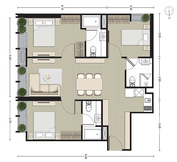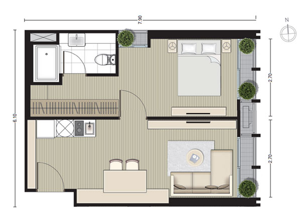 แบ่งเป็นห้องแบบ 1 ห้องนอน, 2 ห้องนอน และ 3 ห้องนอน