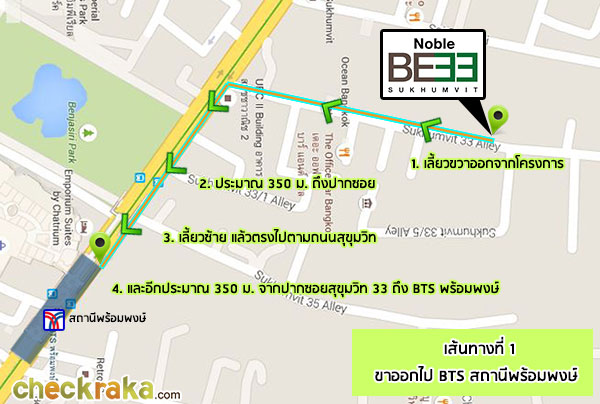 - การเดินทางเข้าออกโครงการ - การเดินทางเข้า และออกของโครงการนี้ มีให้เลือกหลากหลายเส้นทางมาก แต่จะพูดถึงเส้นทางหลักๆ 3 เส้นทางนะคะ เริ่มจากเส้นทางที่ 1 มาจากซอยทองหล่อ โดยให้เข้าซอยทองหล่อ 13 ตรงไปจนสุดทางจะเจอกับสามแยกให้เลี้ยวขวาตรงหน้า รพ.สมิติเวชพอดี จากนั้นให้ตรงไปตามทางจะมาเจอกับซอยสุขุมวิท 49/11 ตรงไปอีกนิดหน่อยเลี้ยวขวาที่ซอยสุขุมวิท 39 แล้วเลี้ยวซ้ายเข้าซอยพร้อมจิต ขับตรงไปตามทาง ให้เลี้ยวซ้ายอีกครั้งเพื่อเข้าซอยสุขุมวิท 33 อีกประมาณ 250 เมตรจะเห็นตัวโครงการอยู่ขวามือค่ะ เราไปกันต่อกับเส้นทางที่ 2 เลยนะคะ จะเลือกวิ่งมาจากแยกอโศก โดยจะขับตรงไปตามถนนสุขุมวิทฝั่งขาออก เมื่อถึงแยกสวัสดีให้เตรียมชิดซ้ายได้เลยค่ะ จากนั้นให้ขับเข้ามาในซอยสุขุมวิท 33 ระยะทางจากปากซอยประมาณ 350 เมตร จะเห็นตัวโครงการอยู่ทางซ้ายมือค่ะ เส้นทางสุดท้ายเราเลือกมากจากถนนเพชรบุรี เข้าซอยเพชรบุรี 38/1 (แยกพร้อมพงษ์) ซอยนี้จะอยู่ข้างๆ ตึกอิตัลไทยค่ะ ขับตรงไปเรื่อยๆ เมื่อเจอทางแยกให้เลี้ยวซ้าย และเลี้ยวขวา ตรงมาเรื่อยๆ ตามทางบังคับ ให้เลี้ยวขวาจะเห็นป้ายซอยพร้อมจิตอยู่ทางขวามือ ขับตรงมาเรื่อยๆ เลี้ยวซ้ายตรงร้าน Rakuten จะไปออกซอยสุขุมวิท 33 ตัวโครงการอยู่ทางขวามือค่ะ