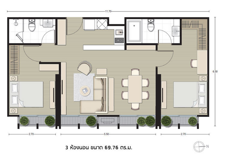 Layout ห้องแบบ 3 ห้องนอน ขนาด 76.82 ตร.ม. มี 3 ห้องน้ำ 3 ห้องนั่งเล่น และ 1 ห้องครัว (แบบเปิด)