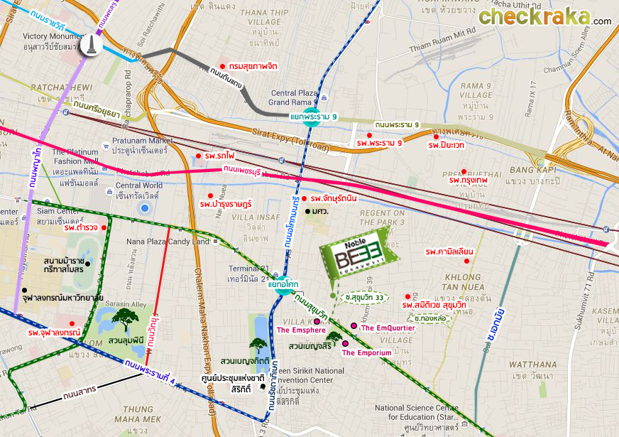 - ทำเลรอบโครงการ - โครงการนี้ตั้งอยู่ภายในซอยสุขุมวิท 33 เป็นโครงการที่ใกล้กับสามห้างฯ ใหญ่ กับ The Em District ได้แก่ ดิ เอ็มโพเรียม, ดิ เอ็มควอเทียร์ และ ดิ เอ็มสเฟียร์ ซึ่งข่าวแว่วๆ มาว่าเมื่อ ดิ เอ็มสเฟียร์ สร้างเสร็จจะมีบันไดเลื่อนถึงหน้าซอยสุขุมวิท 33 และแน่นอนว่าต่อไป Noble BE33 จะมีระยะการเดินทางจากตัวโครงการมาถึง ดิ เอ็มสเฟียร์ เพียง 350 เมตรเท่านั้น นอกจากนี้ยังมีโรงแรม โรงพยาบาล รวมถึงร้านค้า ร้านอาหาร และร้านสะดวกซื้อต่างๆ ที่มีอยู่อย่างหนาตา ถ้ามองออกไปที่ซอยถัดไป ได้แก่ Japanese Town อยู่ในซอยสุขุมวิท 33/1 ก็อุดมไปด้วยร้านอาหาร และวัตถุดิบมากมายเกี่ยวกับประเทศญี่ปุ่น เดินออกไปเรื่อยๆ ริมถนนสุขุมวิทจะเจอกับธนาคาร ร้านเบเกอรี่ ร้านอาหารจานด่วน และฝั่งตรงข้ามก็ยังได้สูดอากาศและออกกำลังกายกันแบบเต็มปอดกับสวนเบญจสิริ หากต้องการเดินทางด้วยระยะเวลาอันจำกัดก็มีรถไฟฟ้าเป็นทางเลือกที่ดีโดยสามารถเรียกวินมอเตอร์ไซค์ให้ไปส่งถึงบันไดสถานีพร้อมพงษ์ก็รวดเร็วดีค่ะ และสถานีถัดไปก็คือทองหล่อคงไม่ต้องพูดหรือบรรยายกันให้มากความเลย เพราะซอยทองหล่อเป็นแหล่งรวมที่ช้อปปิ้ง และชิลเอาท์ได้เป็นอย่างดีเชียวค่ะ