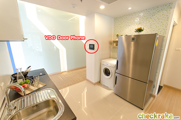 ส่วนฝั่งตรงข้ามจะเป็นพื้นที่สำหรับวางตู้เย็น เครื่องซักผ้า และติดตั้ง VDO Door Phone ไว้บริเวณใกล้ๆ ประตูค่ะ เวลาใครจะมาหาก็สามารถเห็นหน้าและโต้ตอบกันได้กับผู้มาติดต่อบริเวณชั้น 1 และในพื้นที่ครัวนี้ก็หมดกังวลเรื่องน้ำกระเด็นเวลาล้างจานชาม หรือทำอาหารแล้วน้ำมันกระเด็นลงพื้น เพราะเป็นพื้นแกรนิตโต้ สามารถโดนน้ำได้ ทำความสะอาดง่ายค่ะ