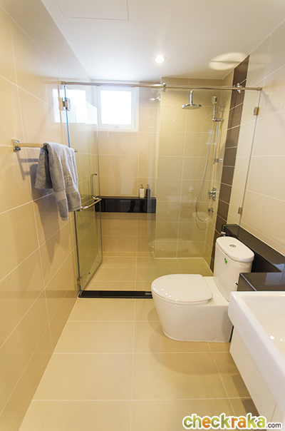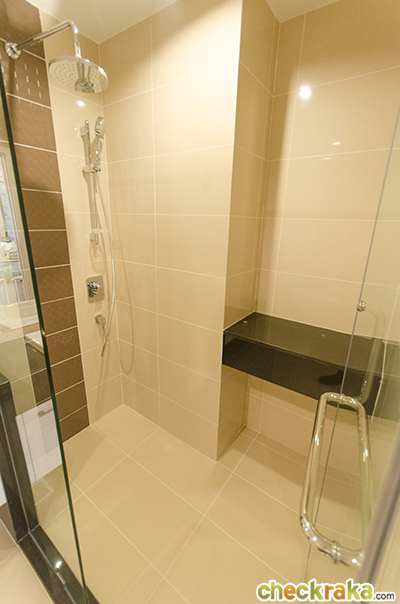 รวมถึง ฉากกั้นอาบน้ำแบบกระจกนิรภัย ฝักบัว Rain shower และเครื่องทำน้ำอุ่นก็ให้มาด้วยค่ะ