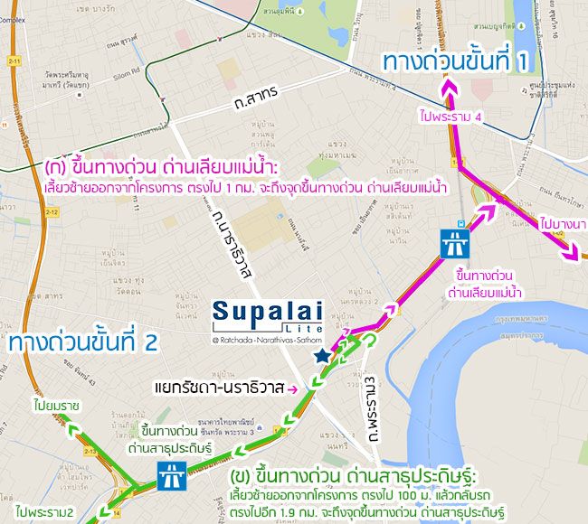 ขาเข้าโครงการ เส้นทางที่ 2 - (ก) ลงทางด่วนพระราม3 และ (ข) ลงทางด่วนสาธุประดิษฐ์