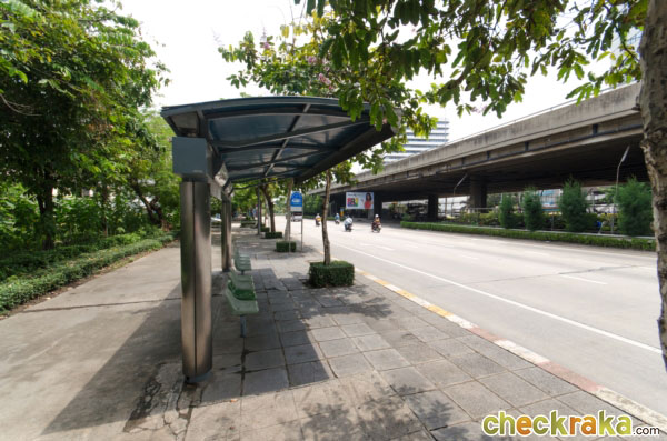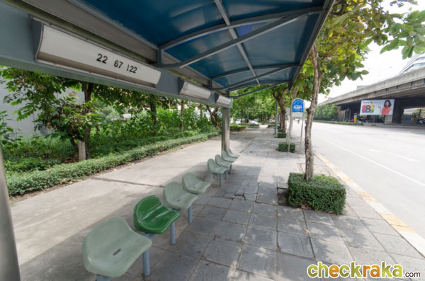 เดินจากโครงการมาประมาณ 120 ม. จะถึงป้ายรถประจำทาง ป้ายนี้ก็จะมีที่นั่งรอด้วยค่ะ