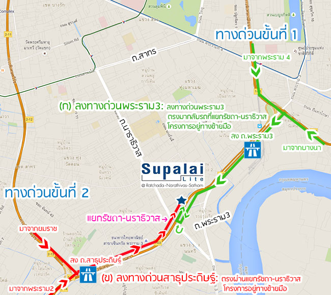 ขาเข้าโครงการ เส้นทางที่ 2 - (ก) ลงทางด่วนพระราม3 และ (ข) ลงทางด่วนสาธุประดิษฐ์