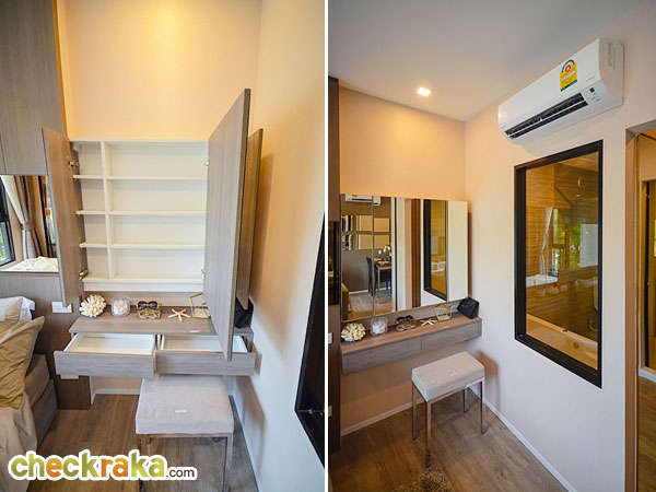 ห้องของโครงการนี้ขายแบบ Fully Furnished ให้เฟอร์นิเจอร์มาเกือบครบของ Starmark ทั้งเฟอร์นิเจอร์แบบ Built-in และเฟอร์นิเจอร์แบบลอยตัว ไม่ว่าจะเป็นโต๊ะ ตู้เสื้อผ้า เตียง ฟูกที่นอน โซฟา ชั้นวางทีวี และผ้าม่าน ยกเว้นเครื่องใช้ไฟฟ้าอย่าง ไมโครเวฟ ทีวี เครื่องซักผ้า และของตกแต่งเท่านั้นที่ไม่ได้ให้มา เรียกว่าซื้อของตกแต่งเพิ่มอีกนิดหน่อยก็พร้อมเข้าอยู่ได้เลยค่ะ นอกจากนี้ทางโครงการยังมีแอร์ของ DAIKIN ติดตั้งมาให้ด้วย โดย 1 ห้องนอนจะได้ 2 ตัว ที่บริเวณห้องนอน 1 ตัว และห้องนั่งเล่นอีก 1 ตัว
