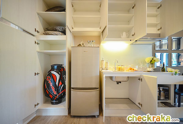ส่วนทางด้านซ้ายมือจะเป็นตู้เก็บของสำหรับเก็บถุงกอล์ฟ กระเป๋าเดินทางก็ได้ ซึ่งอยู่ติดกับพื้นที่ครัว ซึ่งเป็นครัวแบบเปิด