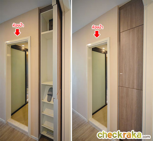 เดินเข้าห้องมาทางขวามือจะมีตู้เก็บของมาให้ซึ่งอยู่ด้านหน้าของประตูห้องน้ำค่ะ