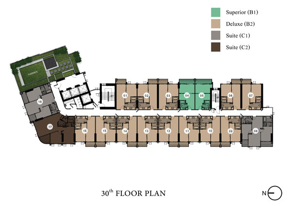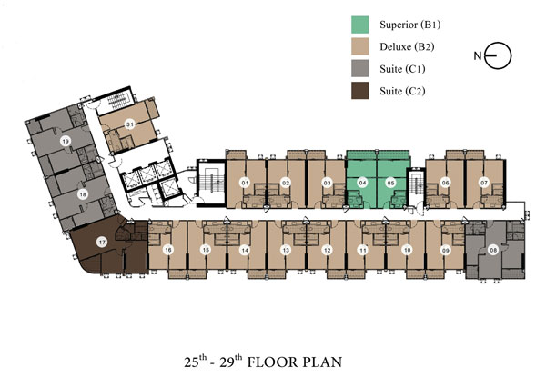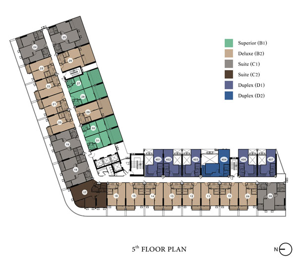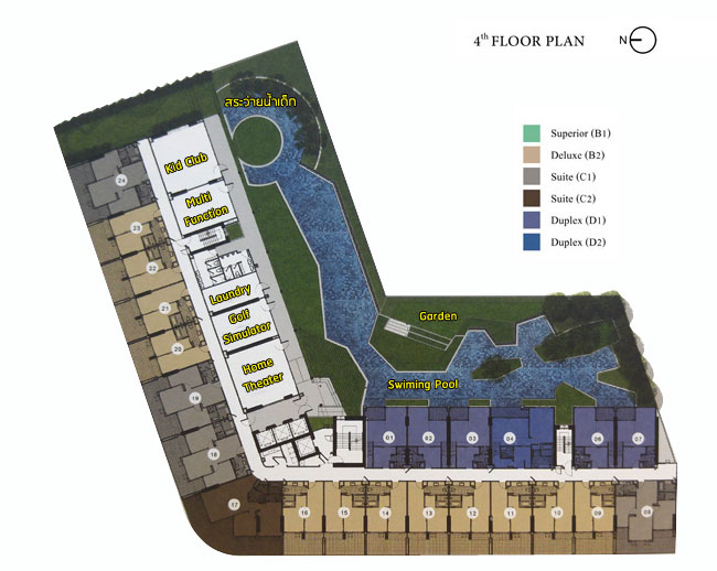 - ห้องชุดพักอาศัย: มี 5 รูปแบบ ได้แก่ Superior, Deluxe, Suite, Penthouse และ Duplex