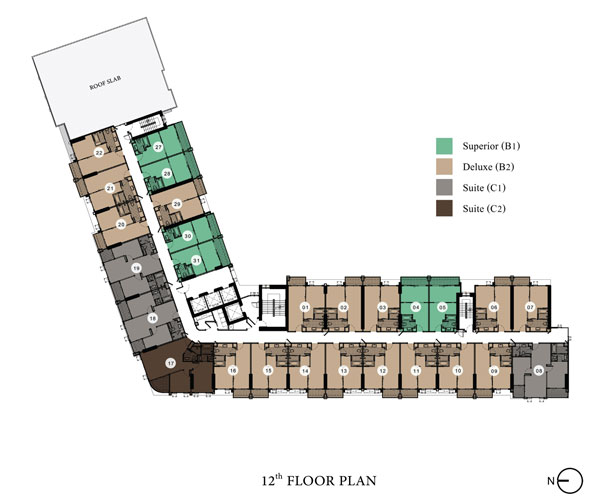 ชั้น 12 : เป็นพื้นที่พักอาศัยทั้งหมด มีจำนวนห้องพักอาศัยอยู่ที่ 31 ยูนิต แต่ชั้นนี้จะมี Roof Slab เพิ่มมาด้วย