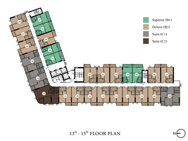 ชั้น 13 - ชั้น 15 : จะเหมือนกันคือเป็นพื้นที่พักอาศัยทั้งหมด มีจำนวนห้องพักอาศัยอยู่ที่ 31 ยูนิต/ชั้น