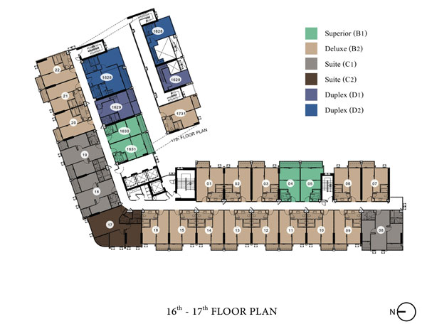 ชั้น 16 - ชั้น 17 : เป็นพื้นที่พักอาศัยทั้งหมด โดย 2 ชั้นนี้จะมีห้องแบบ Duplex เพิ่มขึ้นมาด้วย