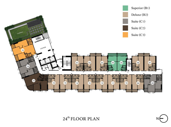 ชั้น 24 : เป็นพื้นที่พักอาศัยทั้งหมด มีจำนวนห้องพักอาศัยอยู่ที่ 19 ยูนิต โดยมีห้อง Suite เพิ่มขึ้นมา