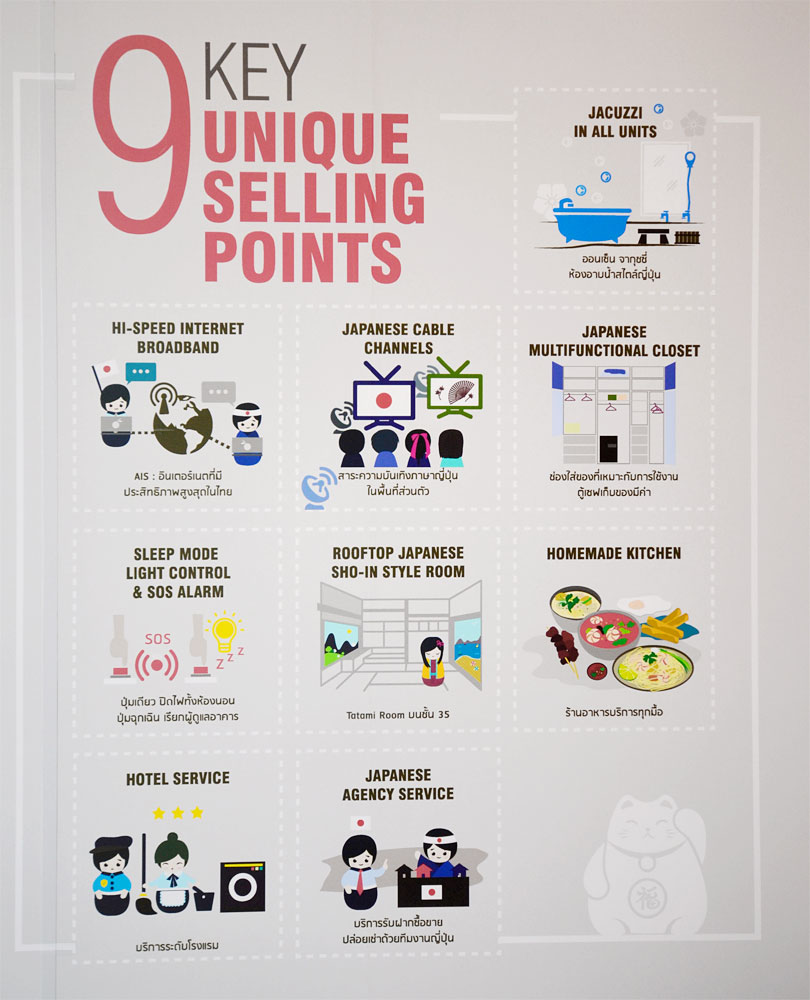 - รูปแบบห้องและวัสดุ - ห้องพักอาศัยแบ่งเป็น 5 รูปแบบหลักด้วยกัน ตั้งแต่ Superior ไปจนถึงห้องแบบ Penthouse โดยส่วนใหญ่จะซื้อไว้ปล่อยให้ชาวญี่ปุ่นเช่า ดังนั้นฟังก์ชั่นหลายๆ อย่างที่ให้มาจึงค่อนข้างเอาใจชาวญี่ปุ่นโดยเฉพาะ ไม่ว่าจะเป็นอ่างจากุซซี่ ซึ่งมีมาให้ทุกห้อง, ฝักบัวแบบ Rain Shower และพื้นที่สำหรับให้นั่งอาบน้ำขัดตัว รวมถึงปุ่ม Sleep Mode Light Control และปุ่ม SOS Alarm ซึ่งถือว่าตอบโจทย์ชาวญี่ปุ่นได้ค่อนข้างดี วัสดุโดยรวมที่ให้มาหลายๆ อย่างถือว่าค่อนข้างดีเช่นกัน ไม่ว่าจะเป็นการซ่อนรางผ้าม่านเพื่อเพิ่มความสวยงาม, ประตูระบบ Digital Door Lock, โถสุขภัณฑ์เป็นแบบ Washlet และผ้าม่านแบบ 2 ชั้น ที่มีมาให้ด้วย