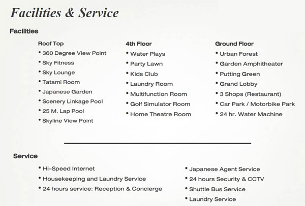 ในส่วนของสิ่งอำนวยความสะดวก ต้องบอกว่าโครงการนี้เค้าจัดมาให้ลูกบ้านเยอะมากๆ โดยเฉพาะชาวญี่ปุ่นรับรองว่าต้องชื่นชอบอย่างแน่นอน เนื่องจากจัดมาเพื่อตอบโจทย์ฟังก์ชั่น Life style ของชาวญี่ปุ่นเป็นพิเศษ เพราะในย่านศรีราชาถือว่ามีชาวญี่ปุ่นอยู่ค่อนข้างหนาแน่น และเชื่อว่าลูกบ้านที่จะมาอยู่ส่วนใหญ่ก็น่าจะเป็นชาวญี่ปุ่นด้วยเช่นกัน โดยสิ่งอำนวยความสะดวกของที่นี้แบ่งออกเป็น 3 โซนด้วยกันค่ะ คือจะอยู่บริเวณชั้น G โดยจะกระจายอยู่บริเวณรอบๆ โครงการ ชั้น 4 และบนชั้น 35-36 ของอาคาร โดยสิ่งที่ทางโครงการให้มาประกอบด้วย