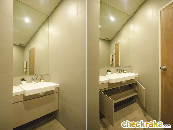 เคาน์เตอร์อ่างล้างมือเป็นของ Mogen ลิ้นชักใต้อ่างล้างมือ สำหรับติดตั้งเครื่องทำน้ำร้อน ซึ่งลูกค้าต้องซื้อมาติดตั้งเอง