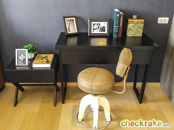 ข้างเตียงได้โต๊ะทำงานสีดำ พร้อมเก้าอี้เก๋ๆ แบบนี้ค่ะ