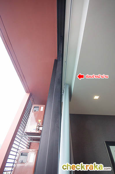 ที่ประตูระเบียงทำเป็นฝ้าหลุม สำหรับซ่อนรางผ้าม่านบังสายตาเพื่อความสวยงาม