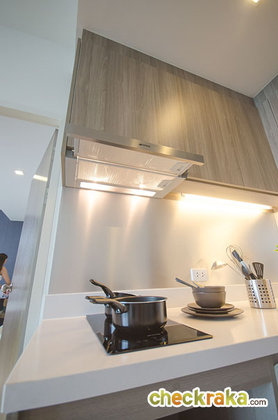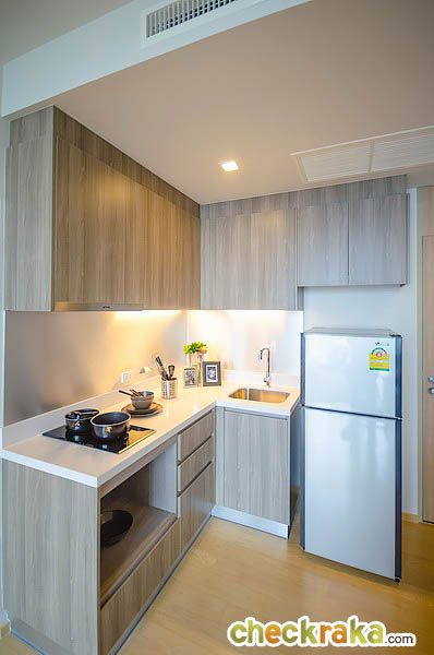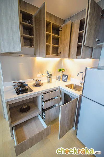 ติดกับประตูจะเป็นส่วนของห้องครัวแบบเปิด ลักษณะรูปทรงตัว L ความสูงของฝ้าอยู่ที่ 2.45 เมตร