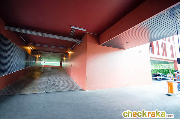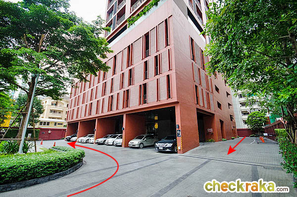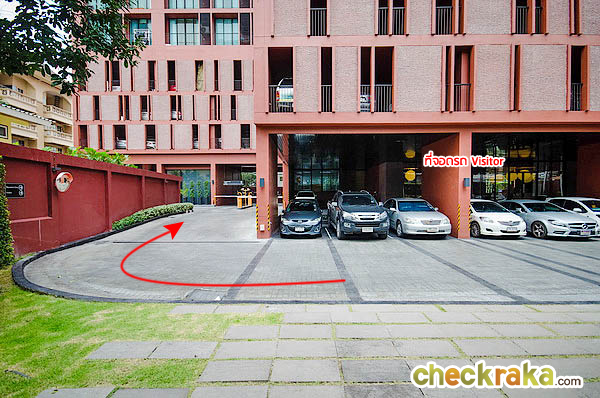 เข้าประตูมาจะเป็นทางบังคับให้เลี้ยวซ้าย เพื่อไปขึ้นลานจอดรถ มีพื้นที่สีเขียวพร้อมม้านั่ง
