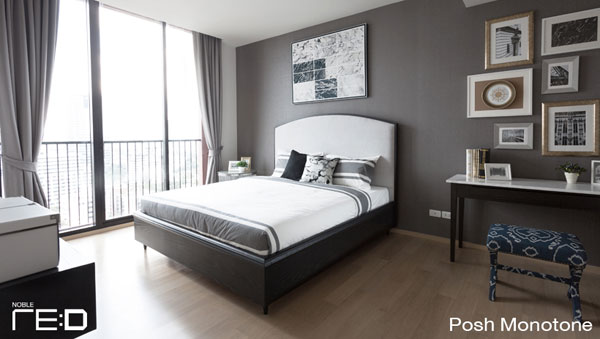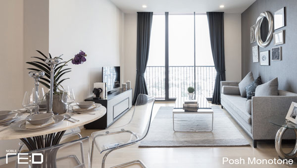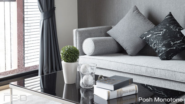 การตกแต่งในสไตล์ Posh Monotone จะแต่งในโทนสีเทา เรียบหรู เน้นไปในแนวหินอ่อน ไม่ว่าจะเป็นโต๊ะทานข้าวหินอ่อน โต๊ะทำงานหินอ่อน น่าจะเหมาะสำหรับวัยทำงาน