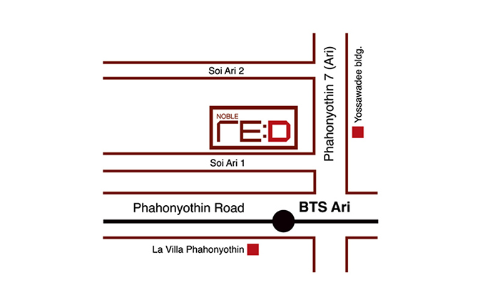 โนเบิล รีดี อารีย์ (Noble RE:D Ari) ตั้งอยู่ในซอยอารีย์ 1 ทำเลในย่านอารีย์ที่อุดมสมบูรณ์ไปด้วยของกินของใช้ เริ่มตั้งแต่ร้านหรูๆ ไปจนถึงรถเข็นข้างทาง ระยะห่างของย่านนี้เองก็ไม่ใกล้ไม่ไกลจากใจกลางเมืองเท่าไรนัก อีกทั้งยังติดระบบขนส่งมวลชนที่สำคัญของคนเมืองหลวงอย่างรถไฟฟ้า โดยโครงการห่างจาก BTS สถานีอารีย์เพียง 80 เมตรเท่านั้น