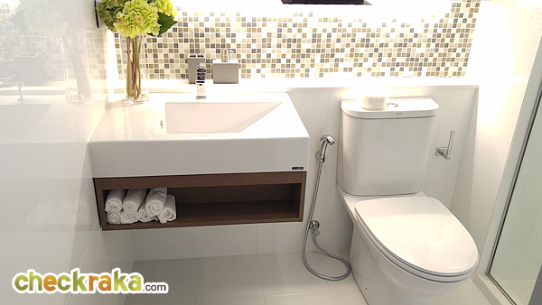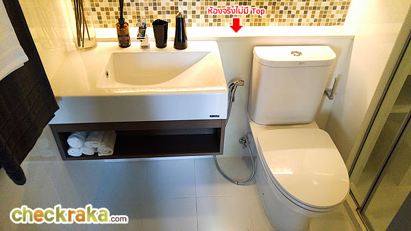 ของจริงโถสุขภัณฑ์กับอ่างล้างหน้าจะชนกับผนังเลย ไม่มี Top ให้ เนื่องจากมีพื้นที่จำกัด