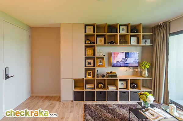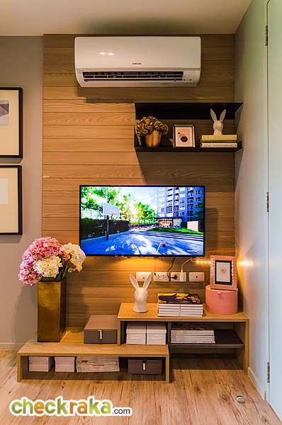 ติดกับเคาน์เตอร์ครัวจะเป็นชั้นวางทีวี โดยโครงการ Built-in ชั้นวางทีวีมาให้ตามแบบนี้