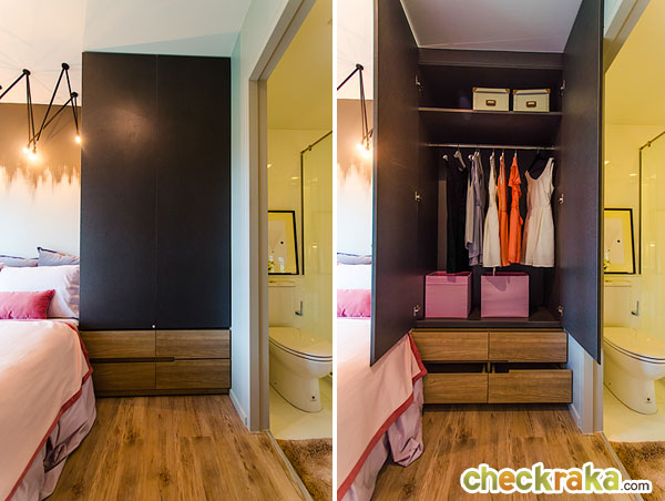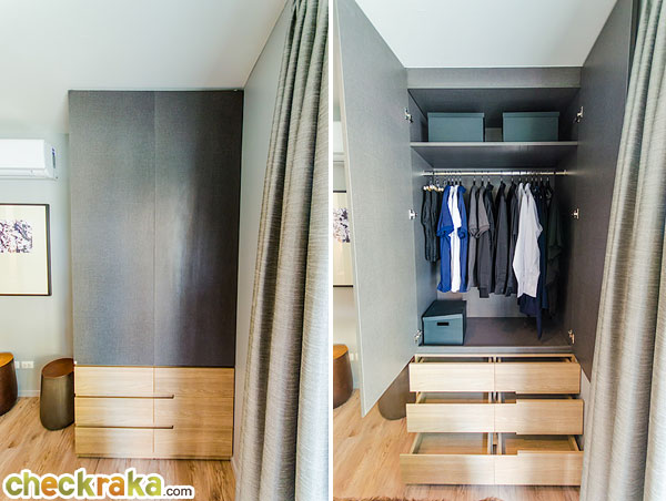 ได้ตู้เสื้อผ้า Built-in สูงจากพื้นถึงเพดาน อยู่ด้านข้างของเตียง